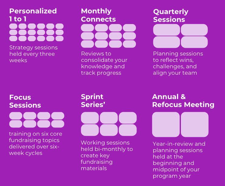 It depends on part-time or full-time fundraising. Participants typically commit 1-3 hours per week to engage with training modules, group and 1:1 sessions, and implementation tasks. The program is designed to be flexible around your schedule.